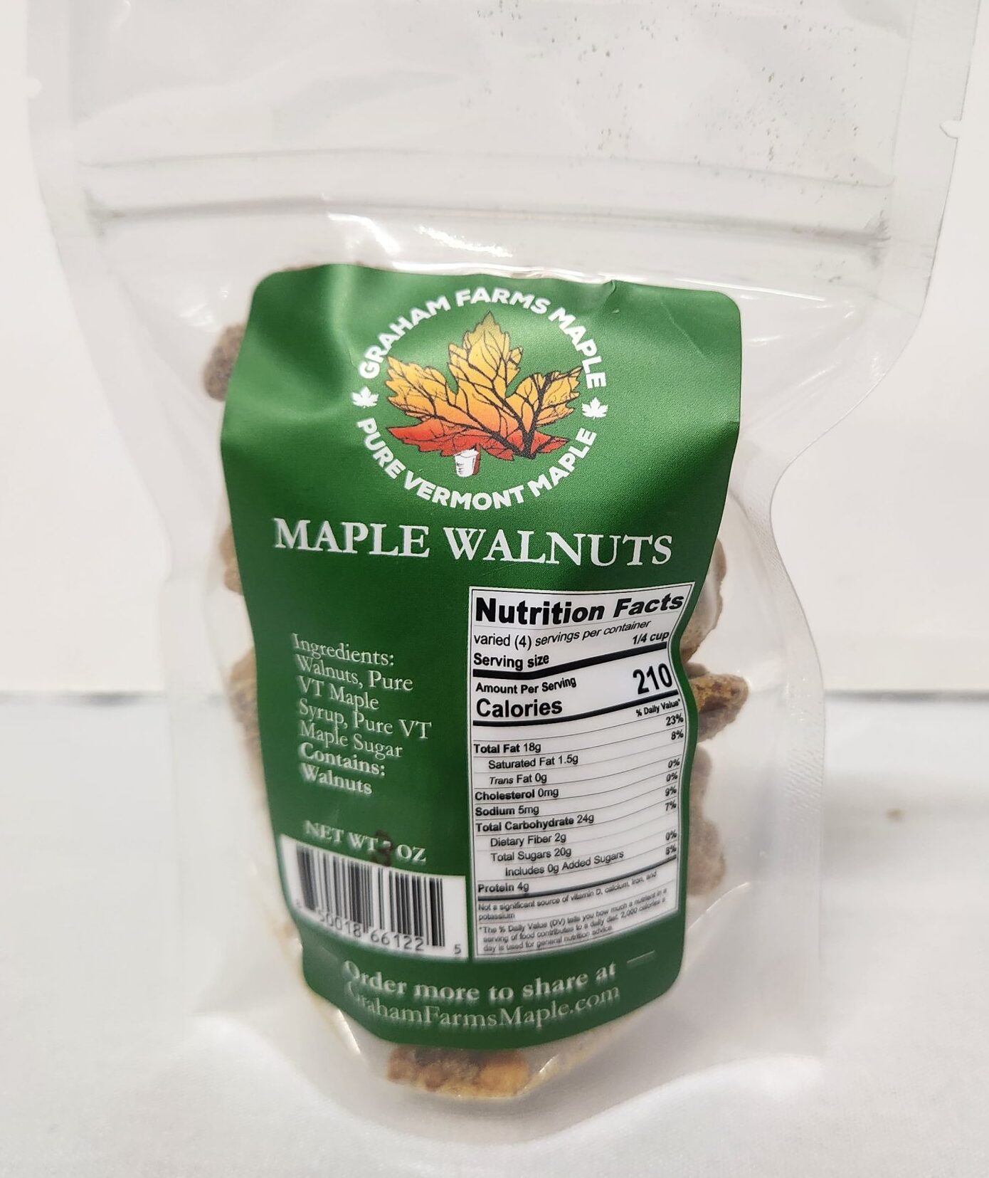 3oz Maple Walnuts in a sealed bag with a tear off top.