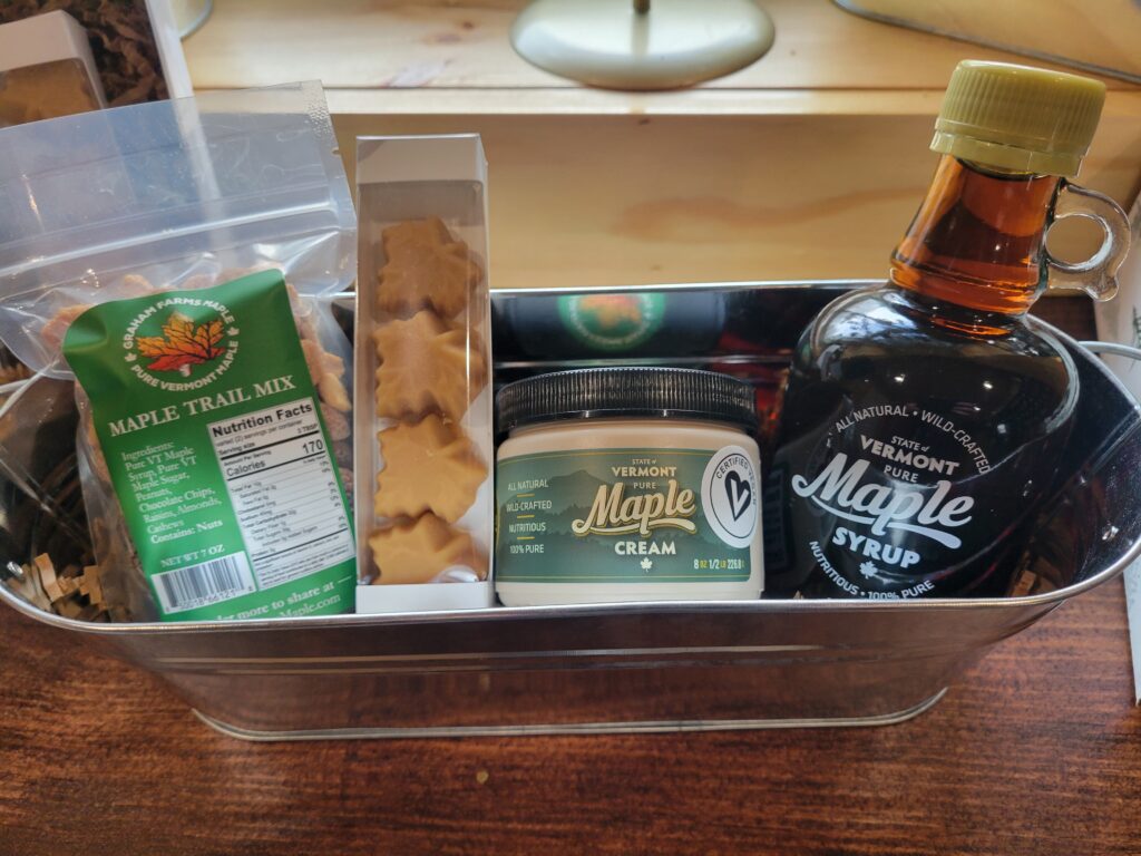 These gift sets can be customized or made to order as pictured. For example: one 3oz maple nut of your choice (almonds, cashews, mixed nuts, peanuts, walnuts, or trail mix) with a 8.5oz glass maple syrup, a 1/2 pound of maple cream and a 4 piece maple candy box.